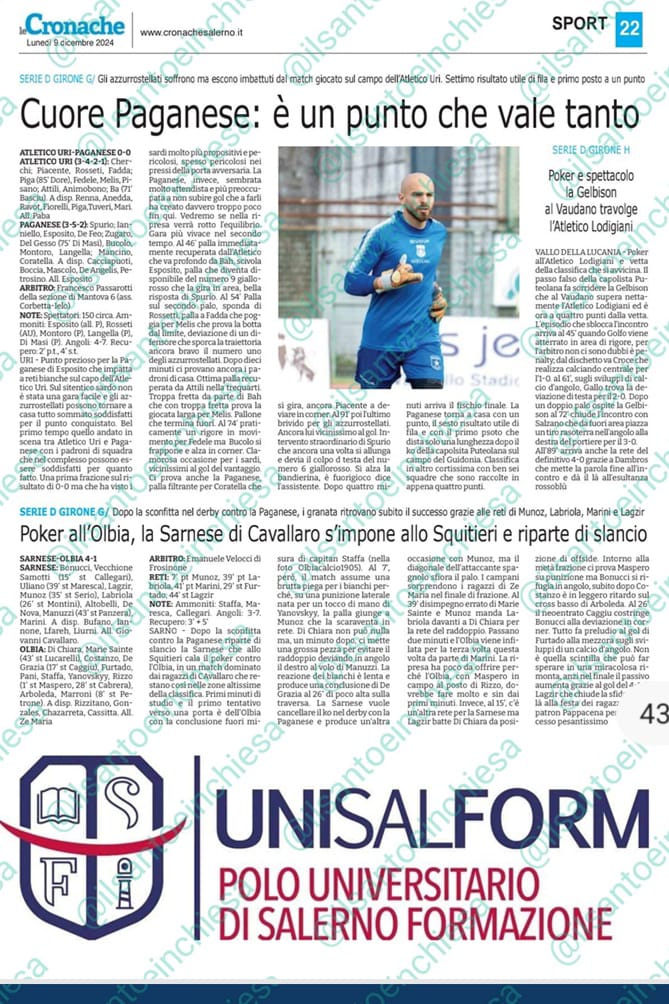0-0 contro l’Atletico Uri. La Paganese non approfitta del passo falso della Puteolana con il Guidonia e accorcia solo le distanze dalla vetta: rimpianti o punto prezioso? La stampa si divide. Ecco cosa scrivono i giornali del match di ieri in terra sarda